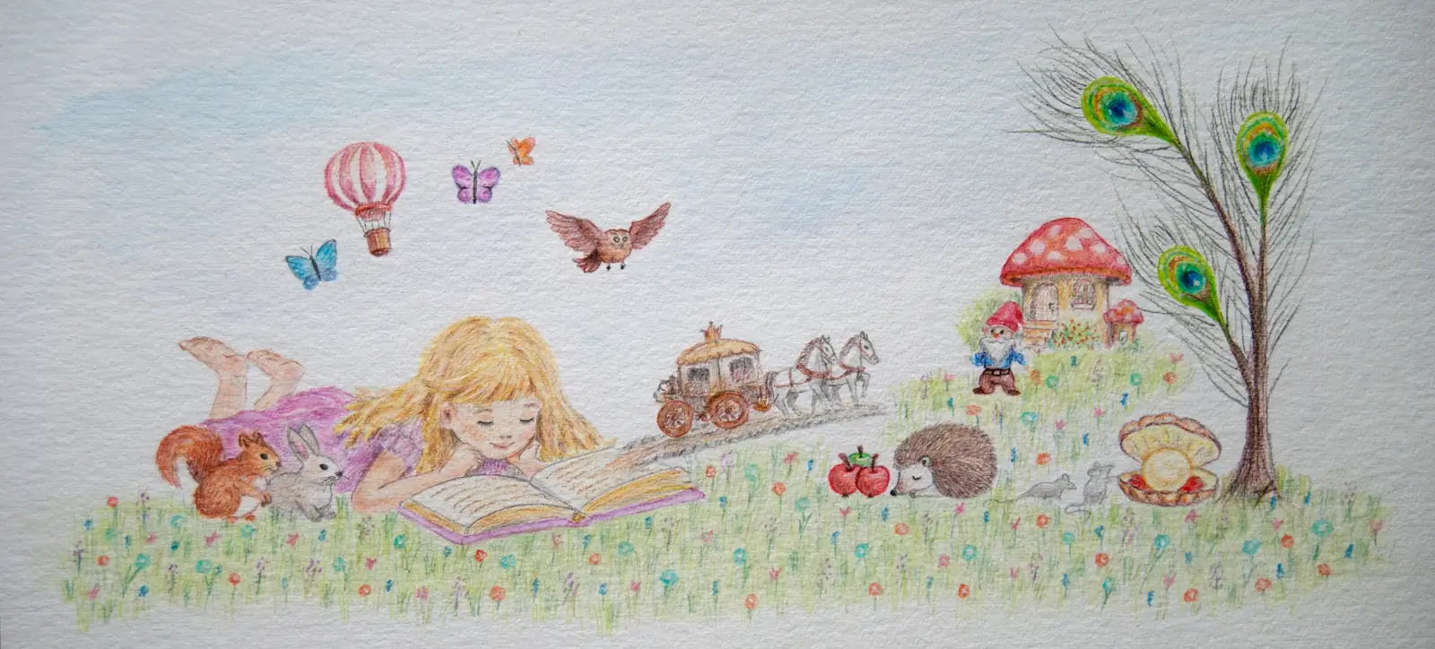 Personalised story commissions for children, crafted to delight and illustrated by hand in a variety of traditional media.